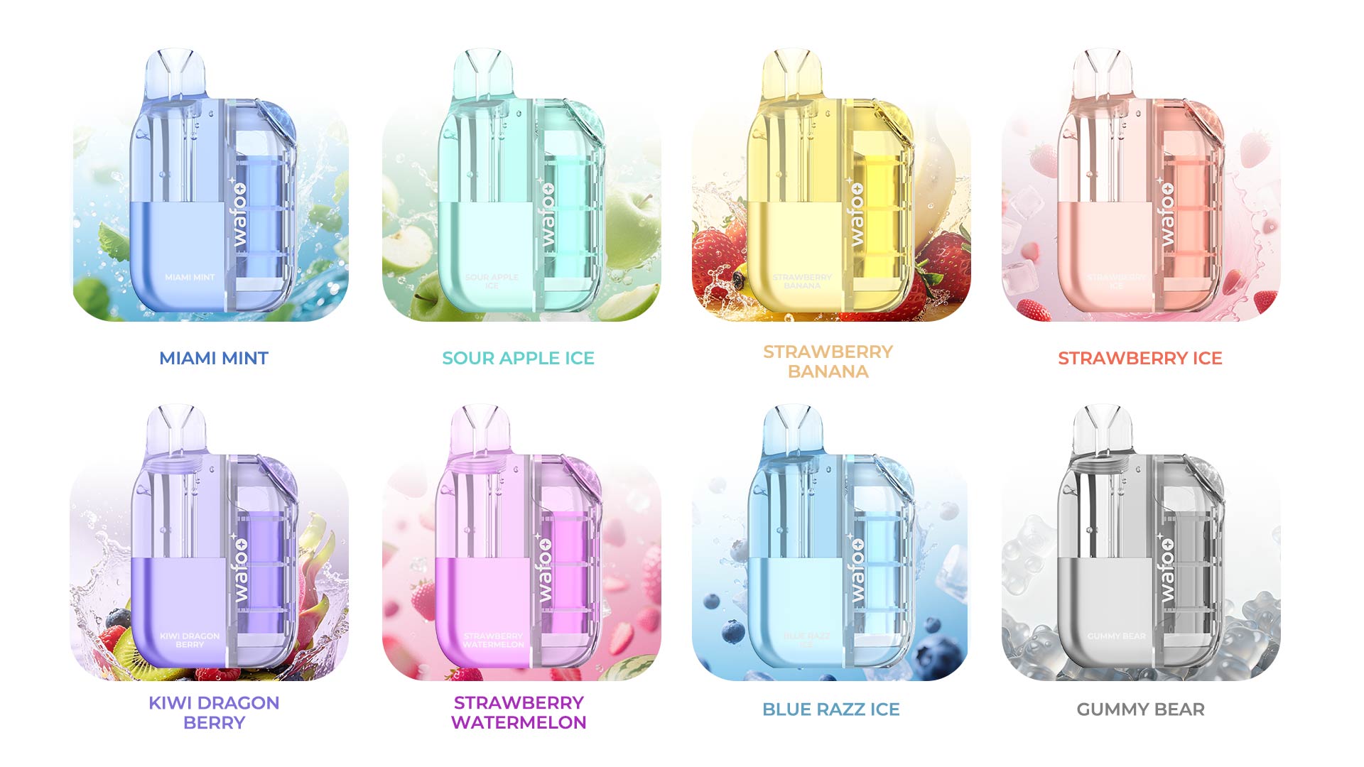 1)Sour Apple Ice  2 )Strawberry Ice   3)Miami Mint   4)Strawberry Banana      5)Kiwi Dragon   6)Gummy Bear   7)Strawberry Watermelon   8)Blue Razz Ice